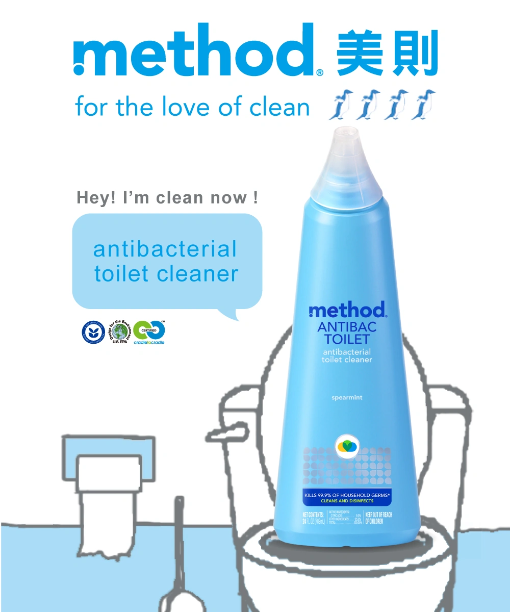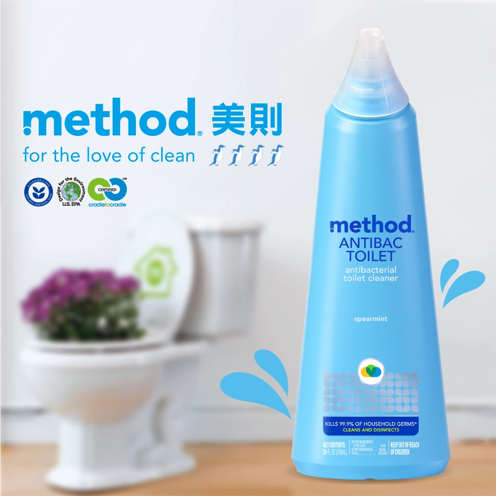 Method 美則除菌終極者專對抗馬桶頑固的髒污及形成的一圈污垢,透過草本植物與檸檬酸的清潔效果加上玉米及椰子萃取的植物成份,不含漂白劑;深層清潔、脫臭與去除鈣質,沒有刺鼻的化學藥味,只有薄荷尤加利的清新香氛。
