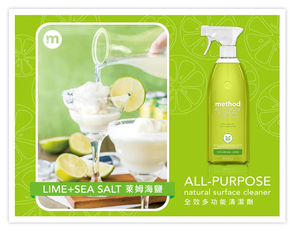 無所不能的迷人海鹽與酸酸的凍檸檬結合,簡直就像海沙充斥在趾縫間,有著身歷海灘邊渡假的感覺。它只會對造成你困擾的髒污出招。 現在,萊姆海鹽帶給你,草本萃取可生物分 解的多功能清潔劑,但是沒有小洋傘!