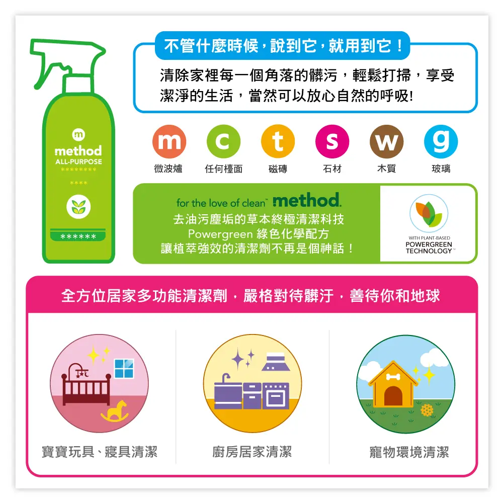 輕鬆打掃,享受潔淨的生活,當然可以放心自然的呼吸!面對手握最先進綠色化學的綠色潔淨科技的你,油膩與髒污根本沒有任何生存的機會,每次一噴,透過無毒的喜悅及禮讚,帶來草本萃取可生物分 解的清潔力,它的清潔力來自玉米與椰子,自然分 解髒污,每次的清潔只留下清新的香氛和亮潔,不必擔心任何殘留! 可以安心的使用在家裡絕大部分的表面-微波爐、烤箱、冰箱、磁磚、大理石、木質、金屬等表面。