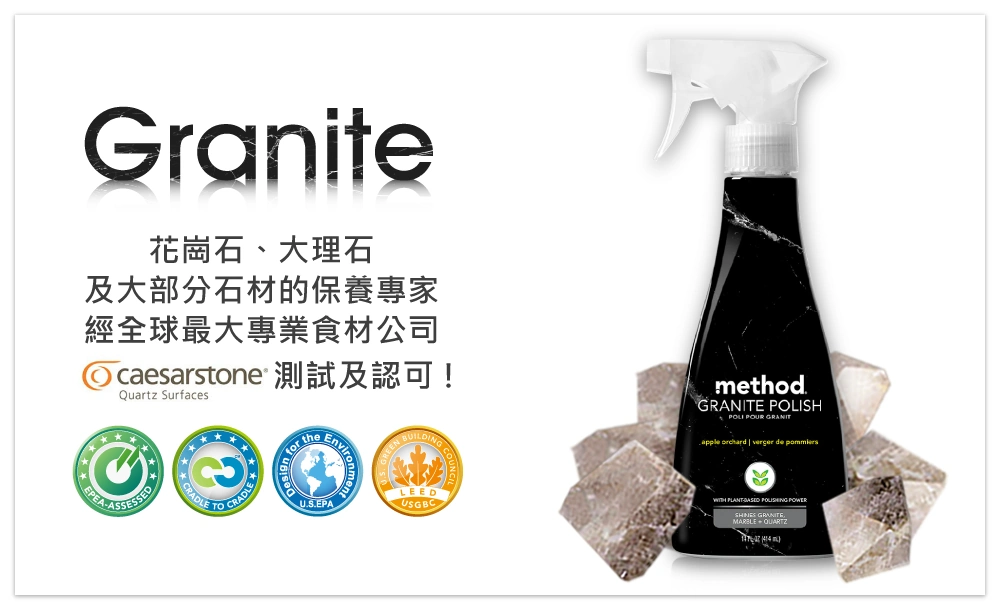 萃取自玉米及椰子的石材清潔保養劑,針對花崗石大理石等材質所設計安全擦淨高級石材,不傷害表面,只留下清潔光亮,無刺激臭味,可迅速生物分解的配方,不對動物做測試,採用100%回收再生的材質所製造的可回收瓶罐,通過美國環保署認可。【酷石清潔劑】本產品經過美國大廠 CAESARSTONE 專業石材公司實際測試,證明有效、光亮,且不傷害石材。