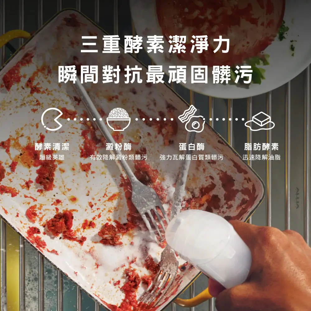 - 酵素潔淨力 採用酵素配方,有效去除高達99%油污,減少50%刷洗力道,同時提升25%泡沫量*